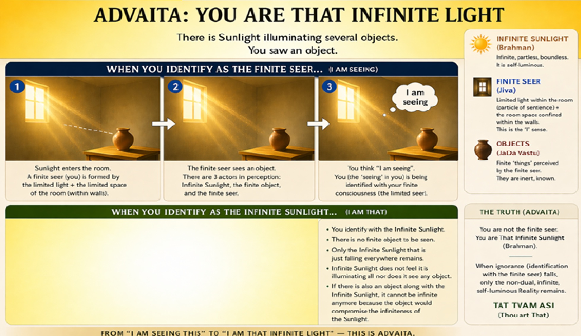 There are five sense organs, eyes, ears, nostrils, tongue, and skin which reveal respective sense objects, namely, form and colour, sound, smell, taste, and touch. There is an illuminator-illumined relationship among each pair of sense organ and sense object. Each pair is unique. They do not mix, e.g., eyes do not hear. The sense objects are categorized according to pre-dominance of the five elements. A sense object will be revealed by a sense organ which has predominance of the same element as that of the sense object. The conclusion is that the sense organs are also made of the five fundamental elements and therefore inert. As such, the Self is different from them.